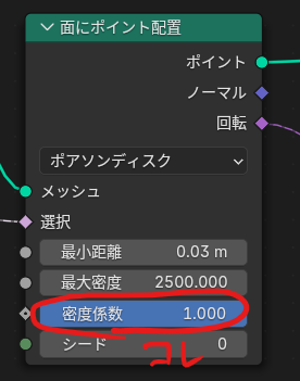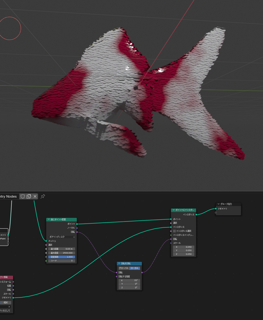 これをジオメトリーノードに入れればいい感じにウロコが生える位置を制御できると思ったんですよ。