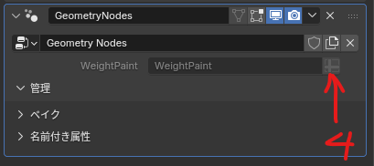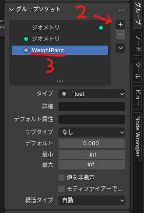 ウェイトペイントや頂点カラー用のノードはないため、以下のようにしてノード内で使用できるようにします。今回はウェイトペイントを使用していますが頂点カラーでも同じ手順です。