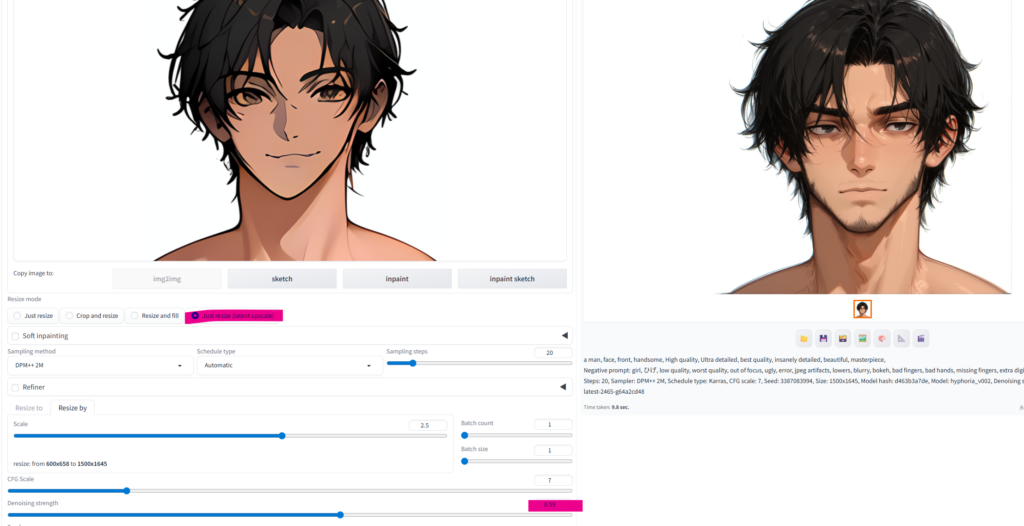 img2imgで、Just ResizeではなくJust resize (latent upscale)を選びます。