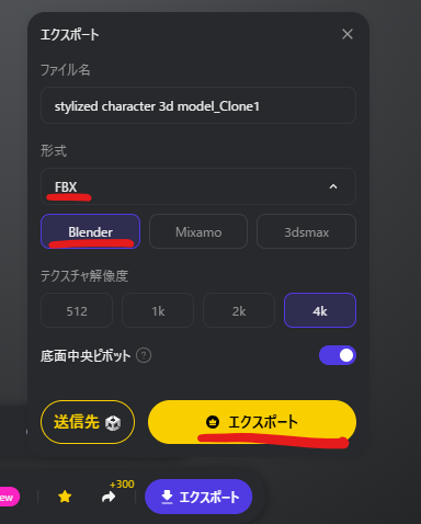 モデルを選択し、画面下部の紫色の「エクスポート」を押したら、