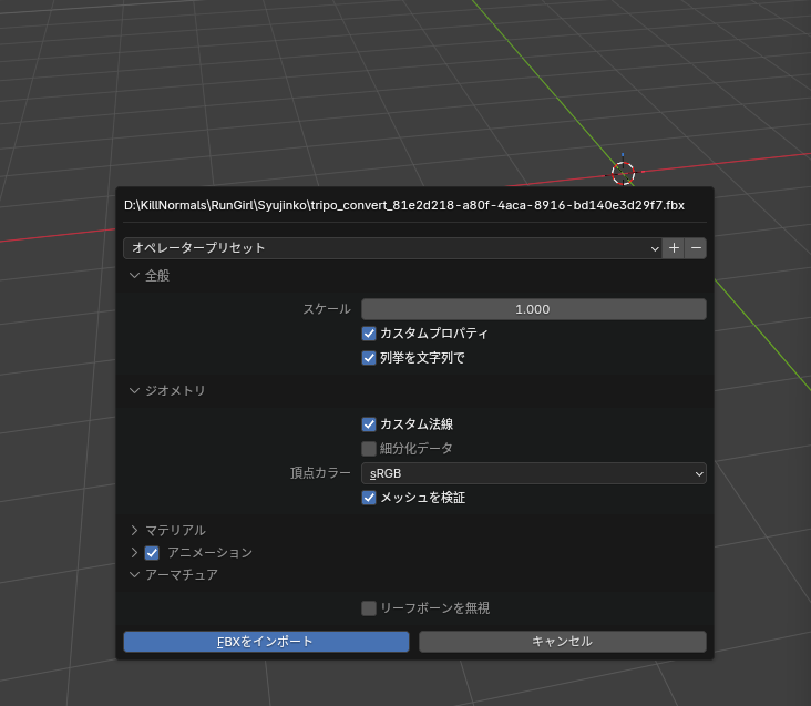 展開したファイルの中にFBXがあります。それをBlenderにドラッグ&ドロップして、そのまま「FBXをインポート」を押します。