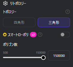 ただし、四角形でリメッシュすると最大で50000ポリゴンまでの上限となっており、前回の記事でご覧いただいた通りだいぶ粗くなってしまいます。