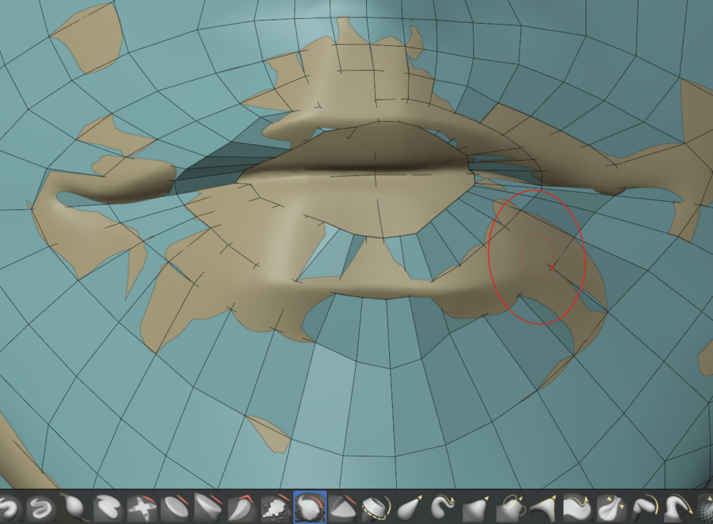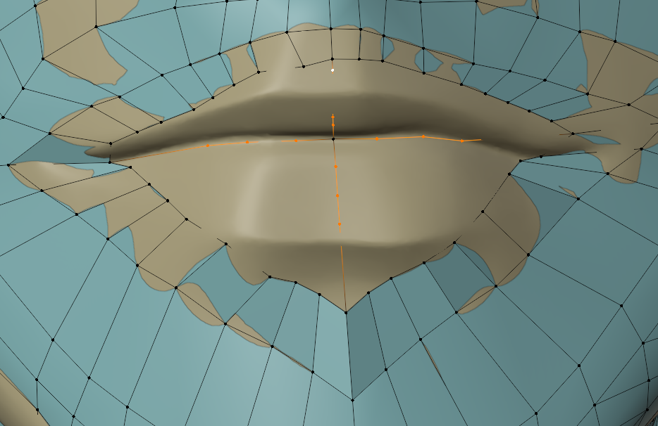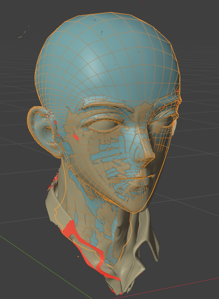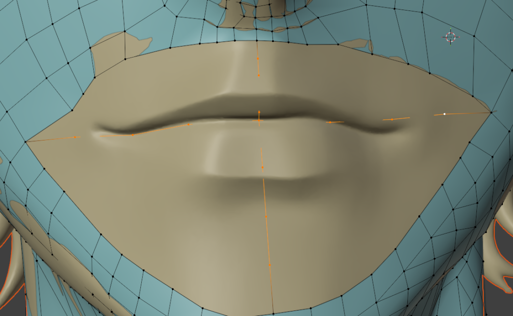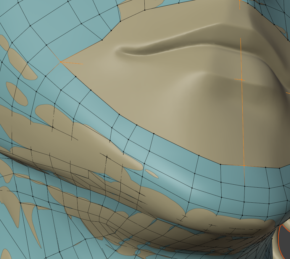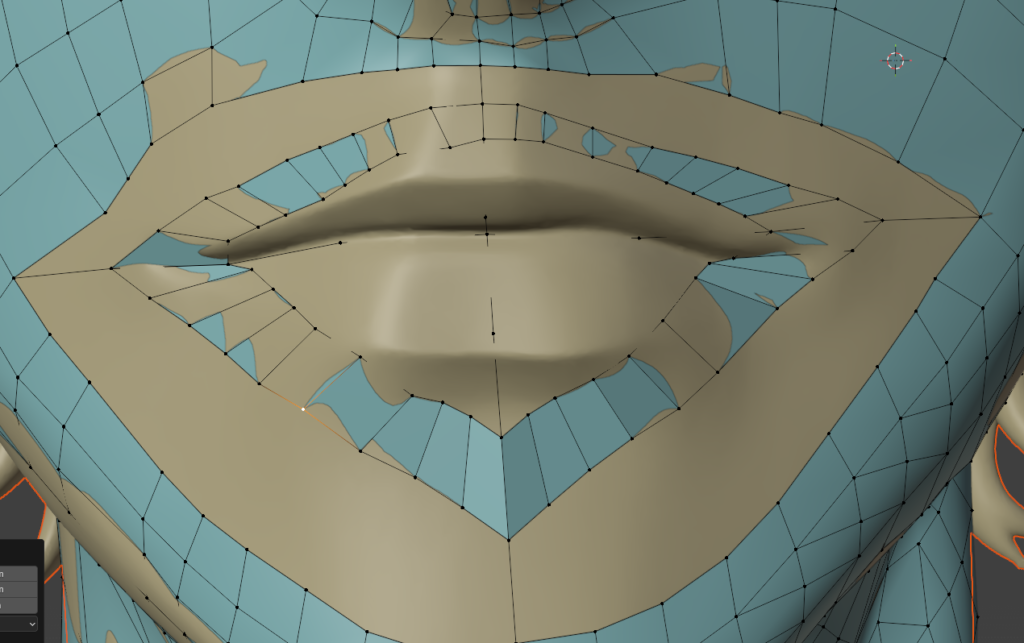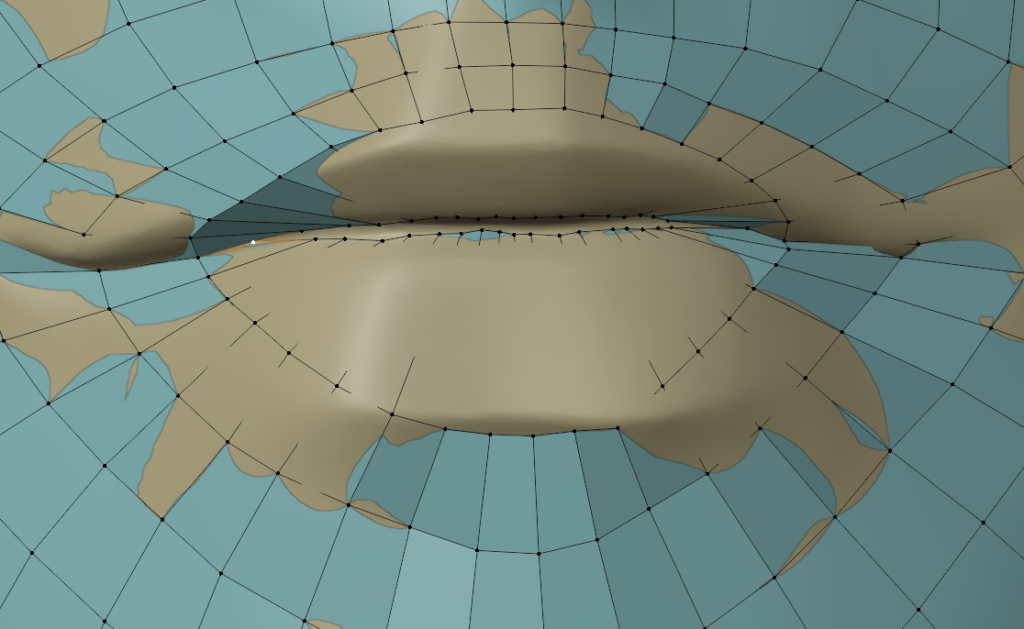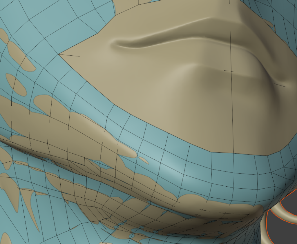 一度作ってしまえば、次回は口元の部分のメッシュだけコピーして、リトポロジーしたいローポリモデルに貼り付け、適当に繋げるとかなりの時短になります。