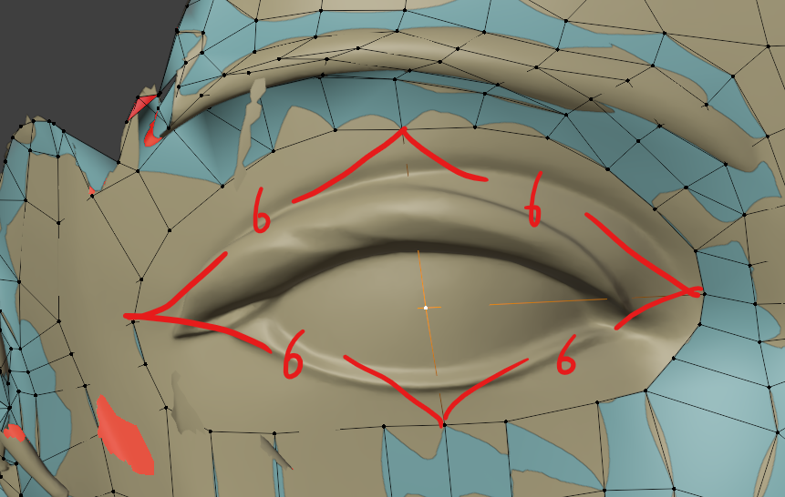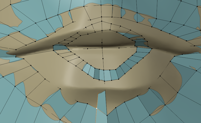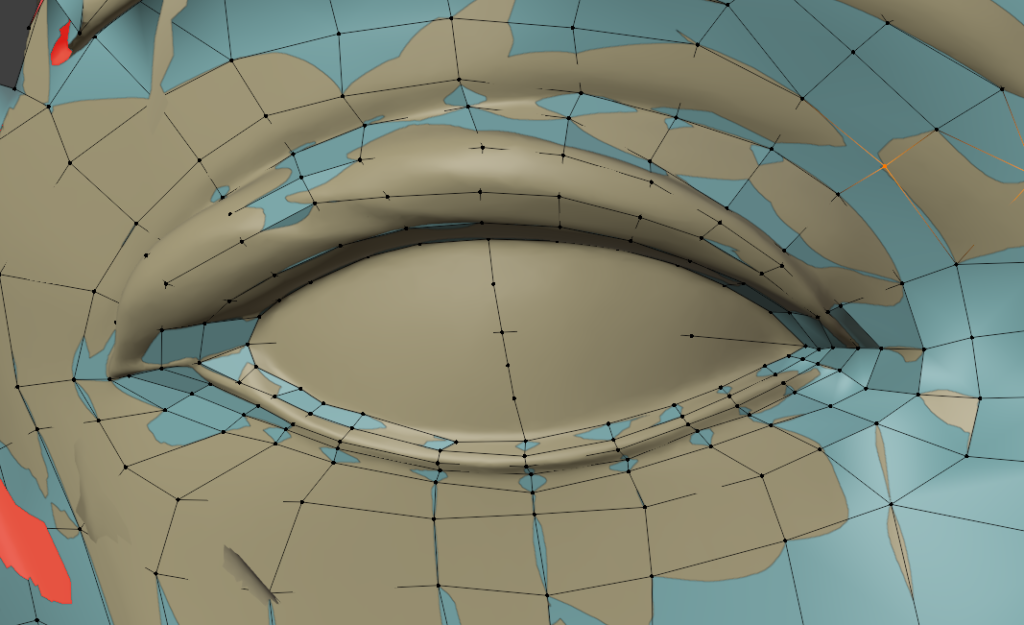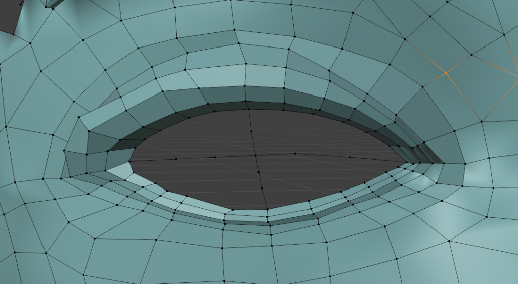 それから、顔面の半分を消して対称化しようと思うので、リトポロジーは片方の目だけでいいですね。