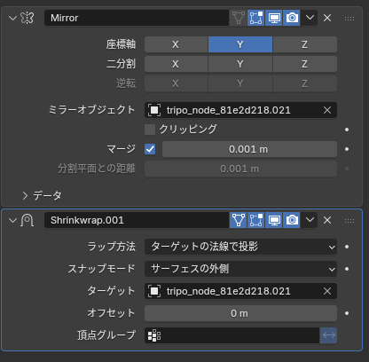 そしたらミラーモディファイアをつけて、シュリンクラップの上にして下さい。