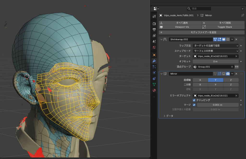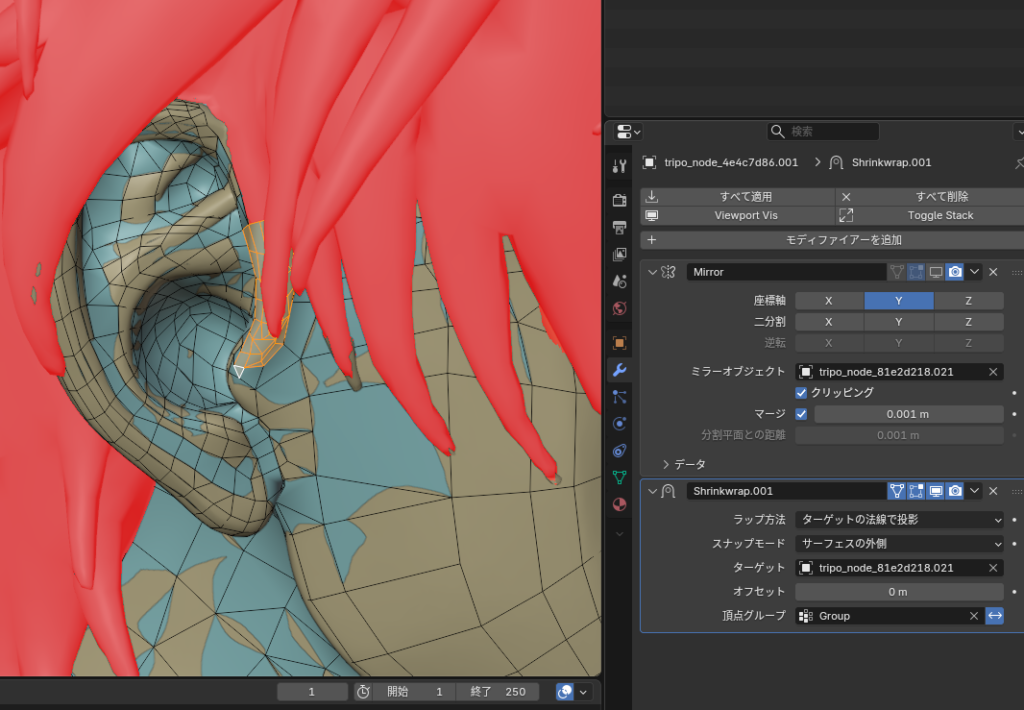 適用する前に、耳のこの辺がシュリンクラップで別の場所に引っ付いてしまっているため、いったん頂点グループに登録してシュリンクラップから除外します。
