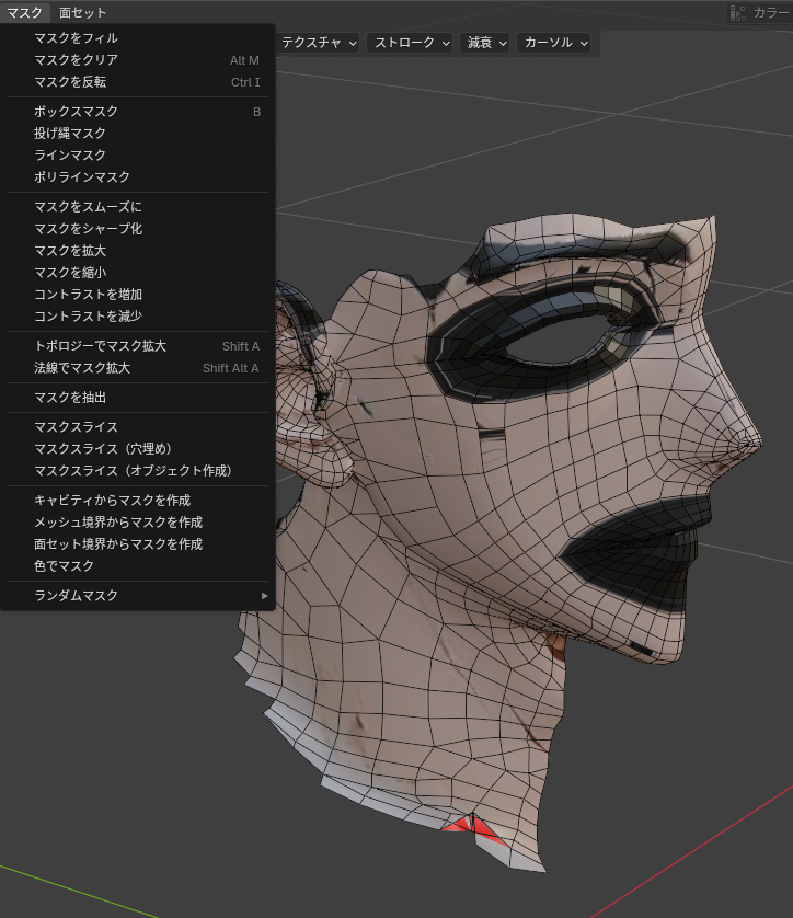 伸長したらスカルプトブラシでなだらかにしていくと楽なのですが、意図しないところまでブラシが影響してしまう事故を防ぐため、編集モードで選択した部分をマスクすると良いでしょう。