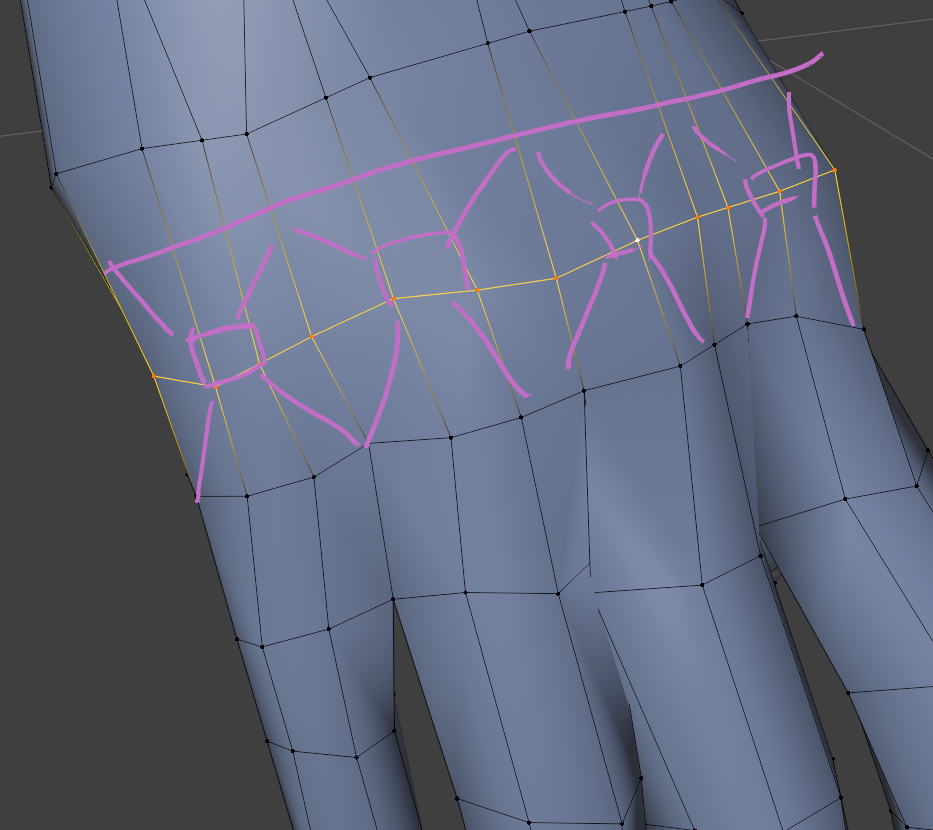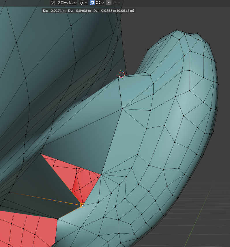 均等になっていない部分はループカットを入れます。ついでにメッシュの流れがおかしかったので直します。