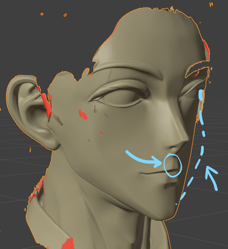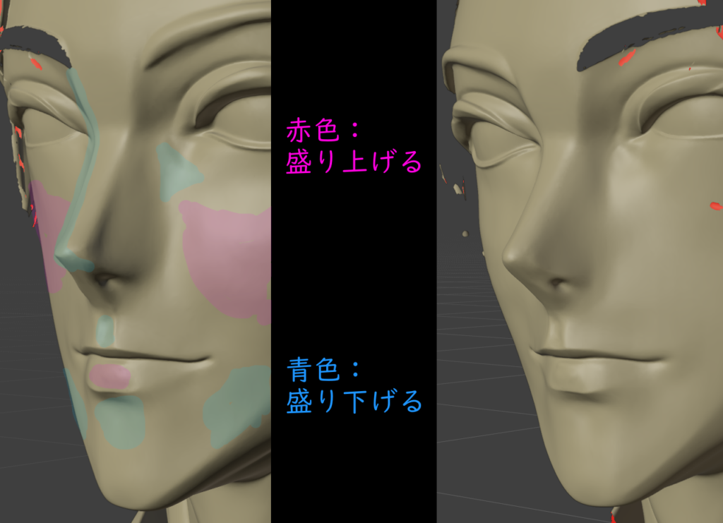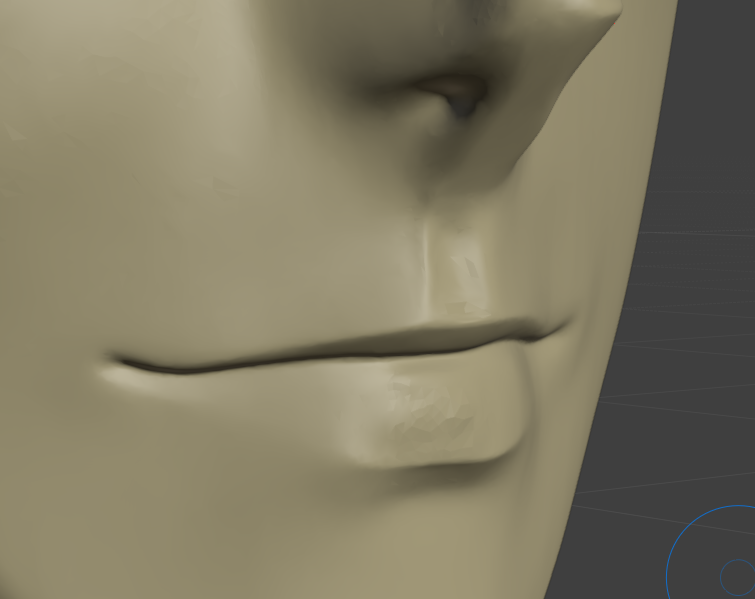 ただ、ハイポリモデルの人中がへこんでなかったり、頬骨が平らになってしまっているので、ハイポリモデルを直します。