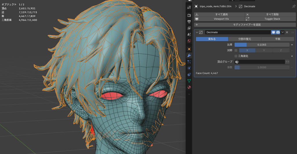 顔が6000ポリゴンなのに対し、髪が21000ポリゴンも使用しており、贅沢すぎます。なのでデシメートモディファイアでとりあえず5000ポリゴンぐらいに減らします。