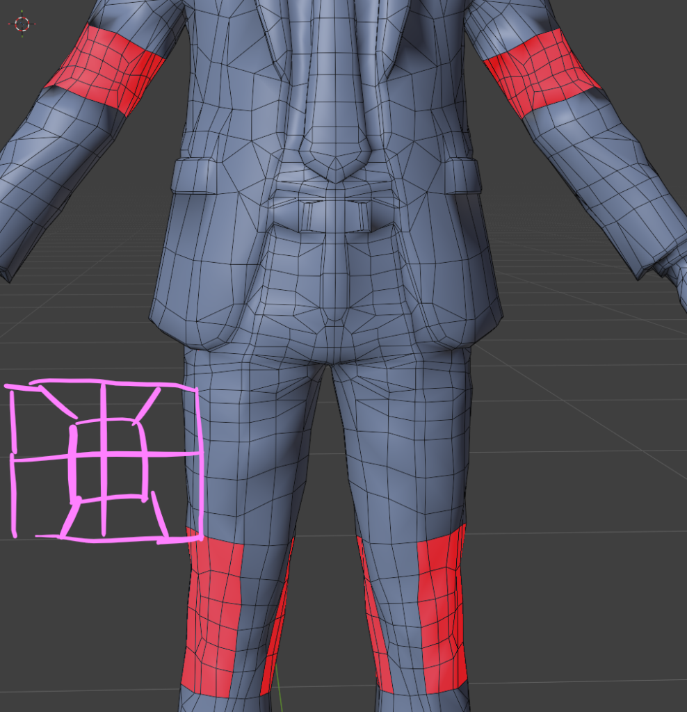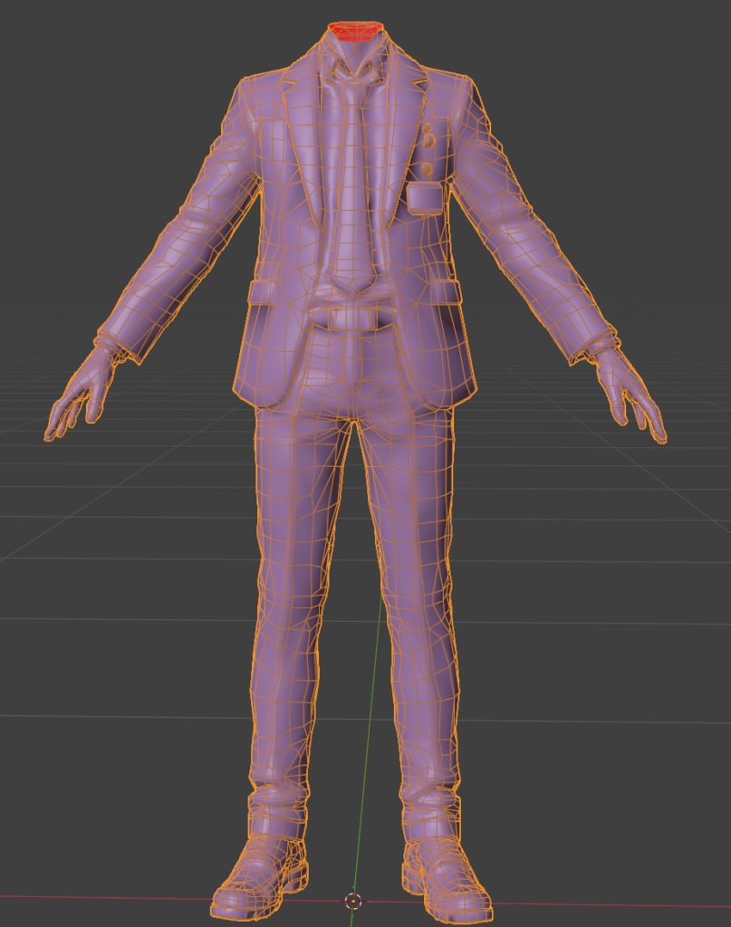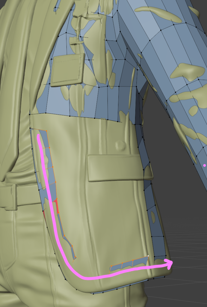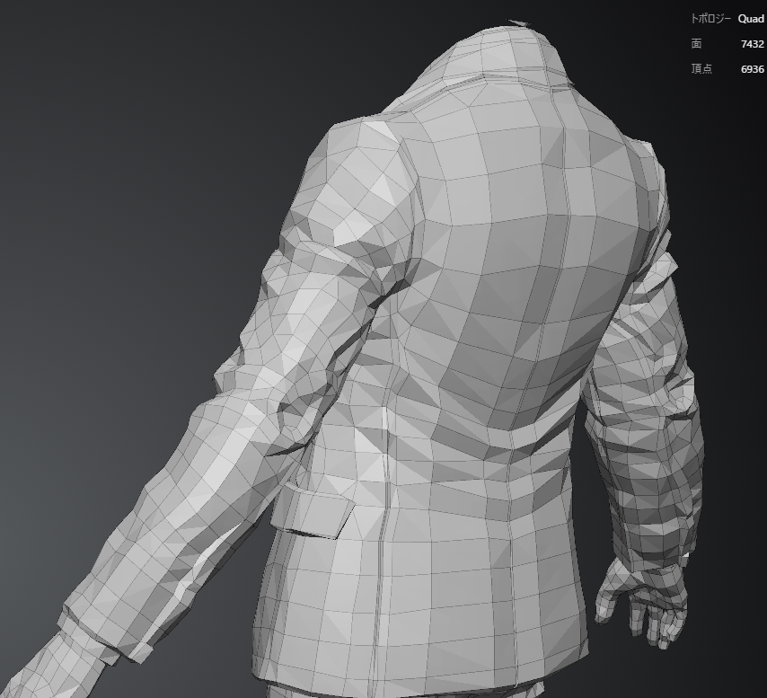スーツの裾、襟の部分は押し出しで作ることでトポロジーの流れを画像のような理想的な感じにできます。